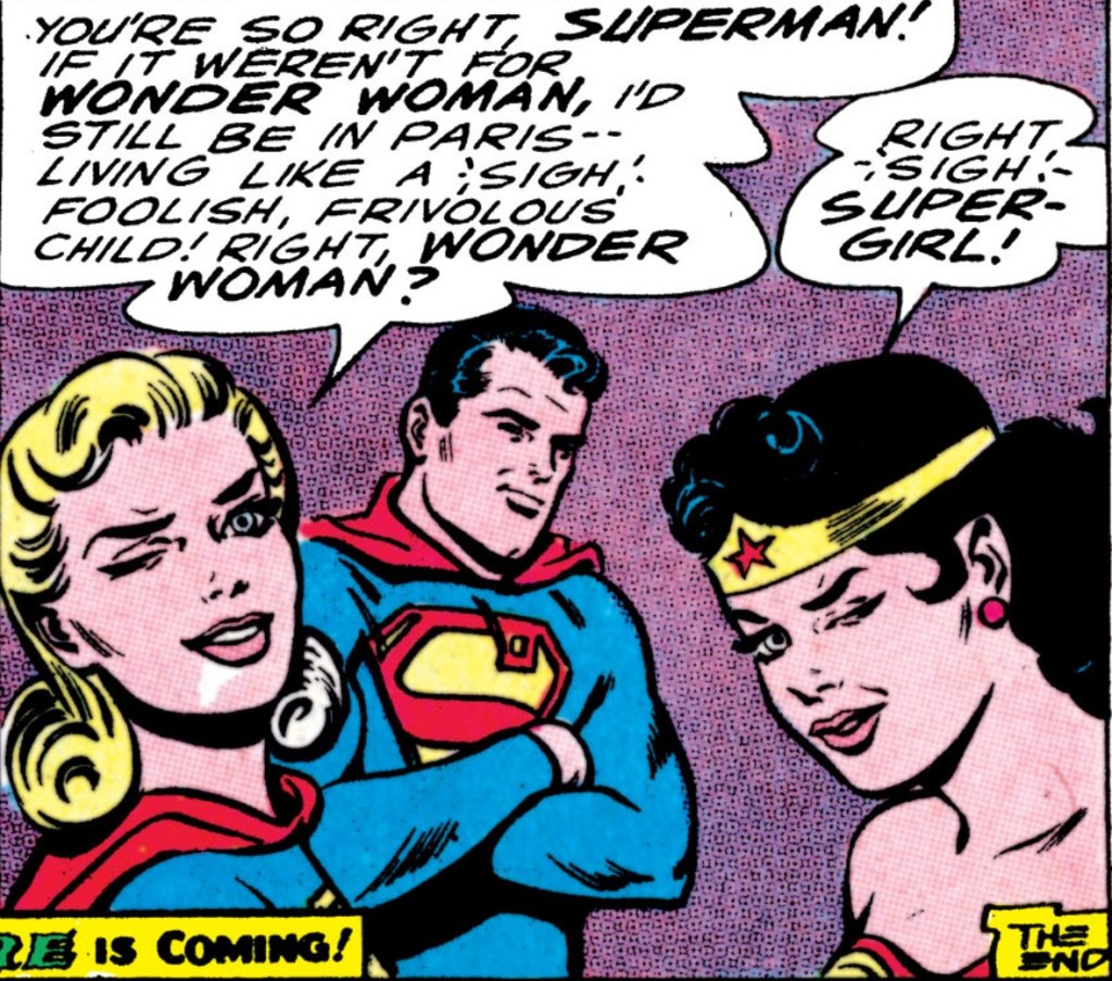 The Brave and the Bold issue 63 presents us with a story of “Two Super-Chicks on a New Kick!” Supergirl and Wonder Woman are the stars of this particular issue and it’s here that the 2 mighty heroines meet for the first time. Bob Haney as writer and John Rosenberger as artist present this story called “The Revolt of the Super-Chicks” in 1965. After rescuing a couple of movie stars and getting no recognition for her amazing feat, Supergirl decides to give up the Superhero life and live as an ordinary girl. She takes a year off college and her foster parents send her on a trip to Paris where she takes up a job as a model, here she is much more recognized and idolized unlike when she was saving lives. Her cousin, Superman, is having none of this and sends the much more mature Wonder Woman after his young cousin to set her back on the path of heroics. The plan unfortunately backfires and Wonder Woman herself is caught up in the joy of living as a woman without any heroic duties. The pair continue on as normal girls and each find a charming young French man to woo over them, and both couples end up on the Ile d’Amour. Here we are introduced to the antagonist of the tale, Multi-Face, who can change is face to whatever he wishes. The two couples carry on with their dates but continue to be met with challenges only their super-powers can handle. A new conflict arises where each girl has a need to save the day, but are unable to show themselves as strong in front of their suitors. Even so, the heroines both continue to preform miraculous feats and find new ways for their companions to be distracted while doing so. Eventually however they both realize that they must work together to stop Multi-Face and go to their respective French boys and tell them that they no longer have time for love. And thus Supergirl and Wonder Woman are back fighting for Justice and Henri and Andre are left alone on the Island of Love as the heroes fly away.