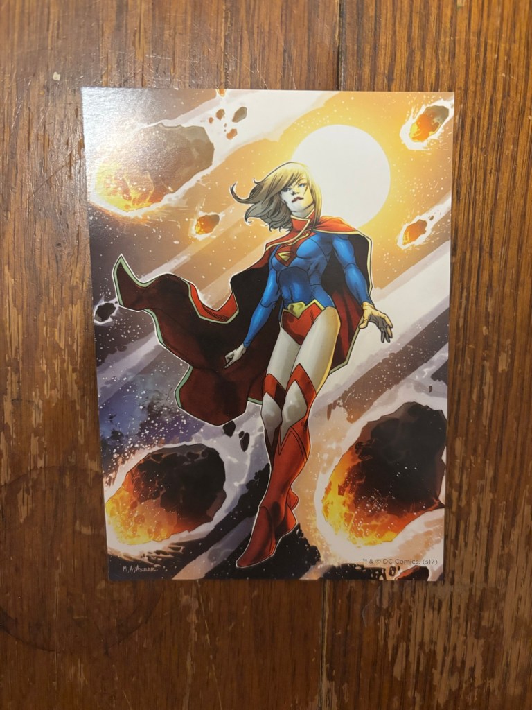 This next item maybe doesn’t exactly count as a card, but it fits here better than anywhere else and I’m not sure when else to talk about it. This was included as part of a collection of artworks from a sort of book called “DC Comics: The New 52: The Poster Collection” this little book came with “40 removable posters” which I grabbed both the Supergirl and Nightwing “posters” from. These are sized more like postcards than posters and are on a sort of cardstock. Unlike the other cards covered today, this art is repurposed from the cover to Supergirl (vol. 6) #1 by Mahmud Asrar and Dave McCaig. I talked more about it in my Supergirl in the Multiverse Earth-52 post, but I’ve really grown on the New 52 costume and I think this poster is a great piece for my collection.