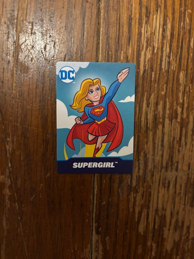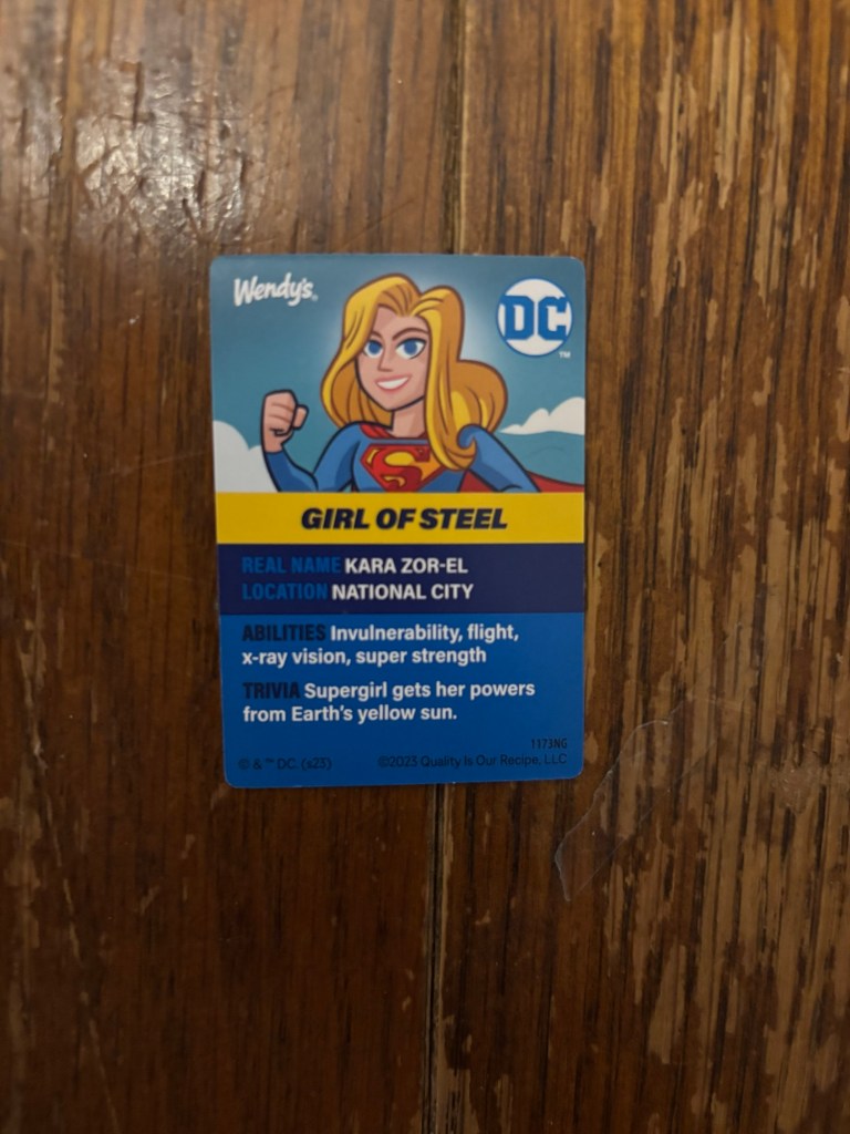Last but not least, although it is the smallest card I have, this little card that came with a Wendy’s toy! I mentioned it in my Action Figure post, but what I didn’t mention was that I actually had this card already when I wrote up my first trading card post. Getting this card actually somewhat inspired me to make the first trading card blog entry, but somehow I forgot to include it. Nevertheless we’re here now and we can talk about this weird relic of specifically National City era Supergirl. If this card didn’t say it was from 2023 I would’ve guessed 2016 or 2017 because that was really the only time in comics where Supergirl operated in National City, although her story in I Saw Ma Hunkle Kissing Santa Claus also mentioned the city. Aside from the somewhat odd inclusion of National City (which is probably the best know home base for the girl of steel thanks to a certain 6 season show) the rest of the information presented here is standard Supergirl information. I do quite like the art (which is also a very 2017 costume for Supergirl) it’s got a nice cartoony pop but it doesn’t say who the artist is.