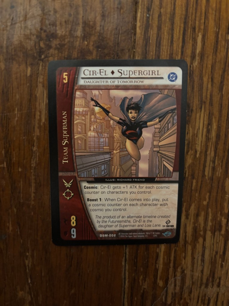 Moving from one dead card game to another, we now get what I’m pretty sure is Cir-El’s only official piece of merchandise. Cir-El was the main universe Supergirl for about a year in 2003 which was perfect timing for her to get a card in the Team Superman set of VS System. Comparing this card to the Kara Zor-El Supergirl covered last time, Cir-El seems to come in a bit under in regards to power level which lines up with her being only half Kryptonian as opposed to full blooded. “Daughter of Tomorrow” is a really good moniker for Supergirl that I don’t know if I’ve seen outside of this card but I might start implementing it some in my writing. “The product of an alternate timeline created by the Futuresmiths, Cir-El is the daughter of Superman and Lois Lane.” Really is the best way to describe this version of Supergirl and in such a brief sentence too. The illustrator is listed here as Richard Friend who I’m not familiar with but they did a good job with the card.