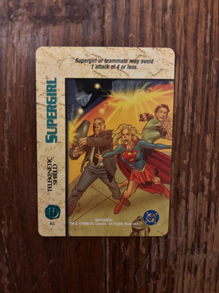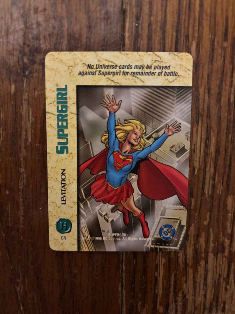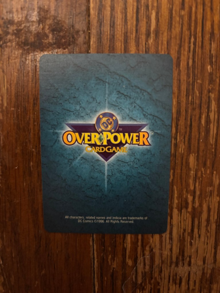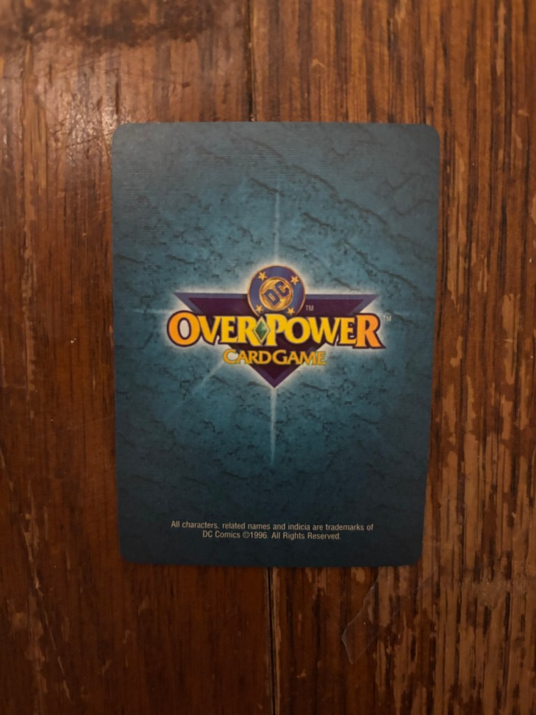 Both this and the next card I’ll show are from the DC OverPower Card Game. While OverPower started in 1995, it would be 1996 before DC characters were added to the game. Much like the VS System I talked about last time, I’ve never played this card game and I have no idea how it works. What I do know however is that I found this card in a box full of a bunch of other superhero cards that were all 5 cents each so I can’t imagine they’re particularly popular. The card being called “Telekinetic Shield” is a good reminder that this Supergirl is not Kryptonian and instead a sort of psychic goo being. I don’t recognize the art from anything specific and I would guess it’s original. I don’t see the artist specifically called out but there do seem to be some signatures that read “SAI” and a second one that I’m unable to decipher.