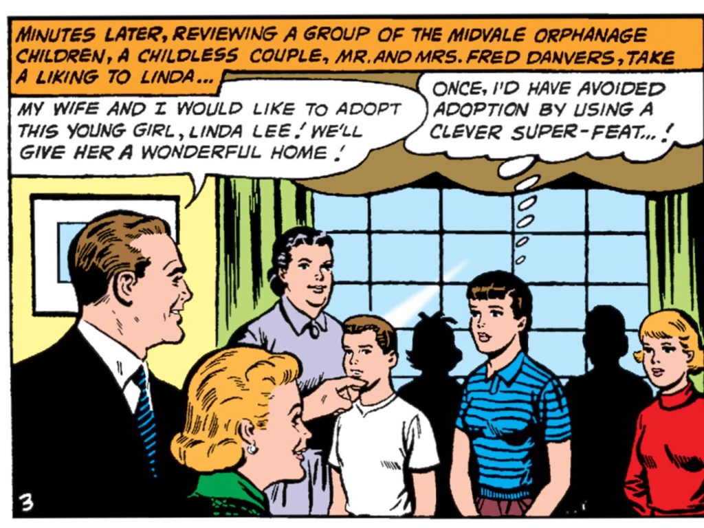 The next issue shows Linda trying to adjust to this new powerless life and coming to realize she no longer has to stay at the orphanage. She can get adopted now without accidentally revealing her identity to her foster parents. And so we meet Mr. And Mrs. Fred Danvers (Edna wouldn’t be named until a few issues later). The introduction of the Danvers is another of the reasons why this story is so crucial to the Supergirl mythos. The Danvers have come to be almost synonymous with the character and have been present in many incarnations since their introduction in this story. Along with the Danvers, we’re also met with the antagonist, Lesla-Lar.