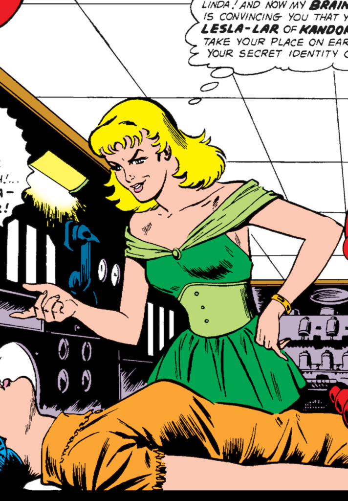 It is revealed here how Supergirl lost her powers. Lesla-Lar is a scientist living in the bottle city of Kandorian who shares a striking resemblance to Kara Zor-El. She has cooked up a plan to take away Supergirl’s powers. With a newly depowered Linda (Supergirl) Danvers, Lesla uses a teleport ray to trade places. While in Kandor, Kara undergoes brainwashing to make her believe she is Lesla-Lar and carries on in Kandor having no idea she ever had powers or was the cousin of the world’s greatest hero. Lesla-Lar on the other hand, now grown to full size and under the rays of earth’s yellow sun, now has superpowers which she plans to use for nefarious deeds.