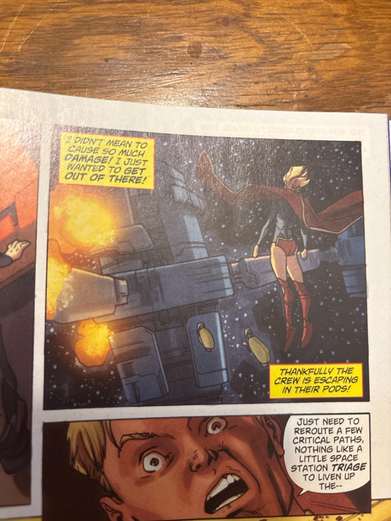I do like the inclusion of this note mentioning the crew’s safety as it shows Supergirl having compassion for humans even so new to the planet. She of course has no kindness for the billionaire that tried to dissect her moments ago.