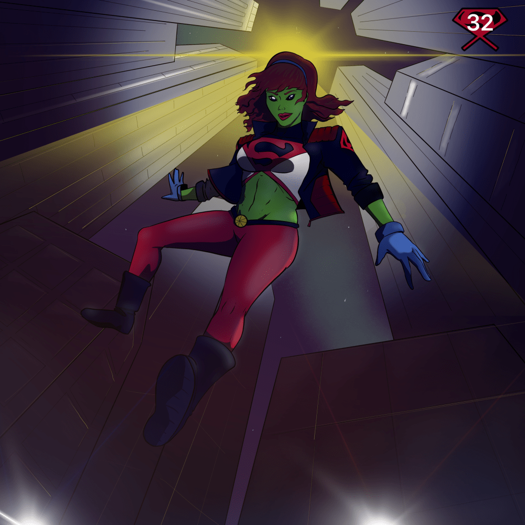 As with all my Supergirl in the Multiverse posts, this is my own artwork. A digital drawing that depicts Ms. Super-Martian jumping down towards the viewer with her arms and legs outstretched. A night sky is obstructed in the background by various skyscrapers. A bright yellow light is backlighting Ms. Super-Martian. The top right corner has a motif of Ms. Super-Martian’s S symbol with a 32 on top of it.