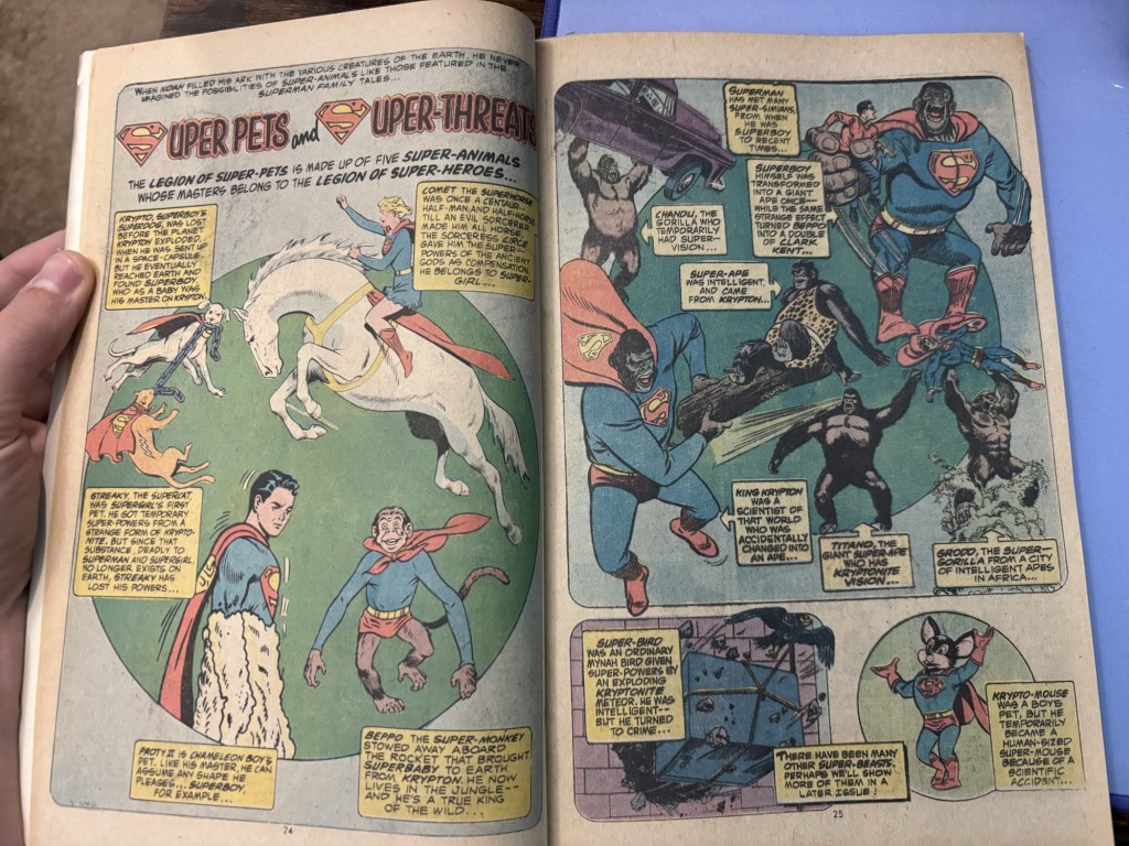 Issue 167, as mentioned before, continues on with the Fact Files but also has a “Super-Special Feature” called “Super-Pets and Super-Threats”. This 2-page spread features an absurd amount of gorillas and not one but two of Supergirl’s Super-Pets, Streaky and Comet. Krypto is also featured on the page and is often associated with Supergirl but here is listed as “Superboy’s Superdog”. Comet’s origin is very quickly told and it says he “belongs” to Supergirl which feels a bit odd when considering the fact that Comet has the mind of a human and romantic feelings for Supergirl. Streaky’s history mentions the fact that he can no longer get super powers because X-Kryptonite was also destroyed along with all the other Kryptonite which I wasn’t aware of so that was fun to learn. We don’t get issue numbers with this Super-Special Feature like we did in the previous few issues so it’s would be a bit trickier for new readers to find these stories but the bios of the pets seem accurate and introduced me to at least 3 characters I was previously unaware of.
