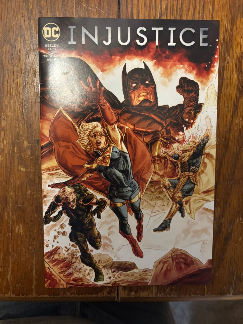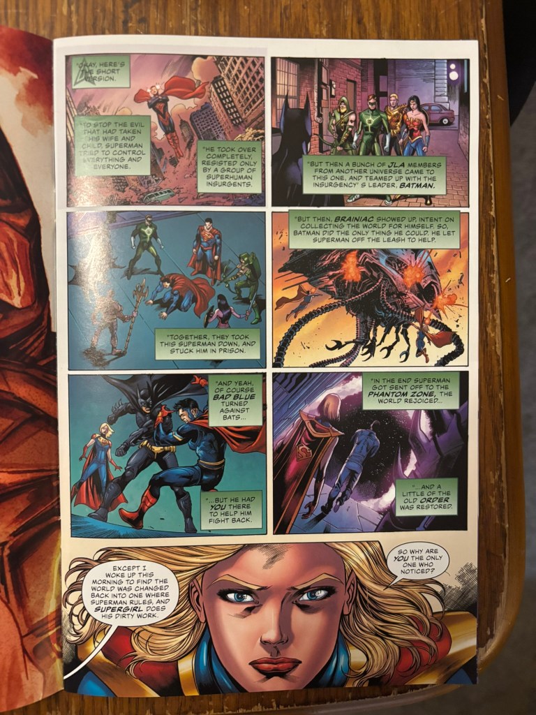 Injustice: Alternate Endings is a one-shot story set in the Injustice universe. Written by Tim Seely, with Jose Luis & Daniel HDR on pencils, Jonas Trindade & Daniel HDR on inks, and Tony Avina providing colors. This comic was not released traditionally in comic shops and was instead paired with 4 of the McFarlane Page Punchers action figures as part of the second wave of Injustice figures. I got this comic along with my Injustice Supergirl action figure but from what I can gather, the Batman, Green Arrow, and Doctor Fate figures also came with this same book. These 4 characters all appear on the cover and in the story but I would argue that the story’s main focus is on Green Arrow and Supergirl. I have not personally played either of the Injustice games so some of my facts may be inaccurate but I have done some research in regards to this story so I have done my best to avoid any errors. From what I can tell, this comic takes place after the events of Injustice 2 and features an Alternate Ending to how the game might have played out.