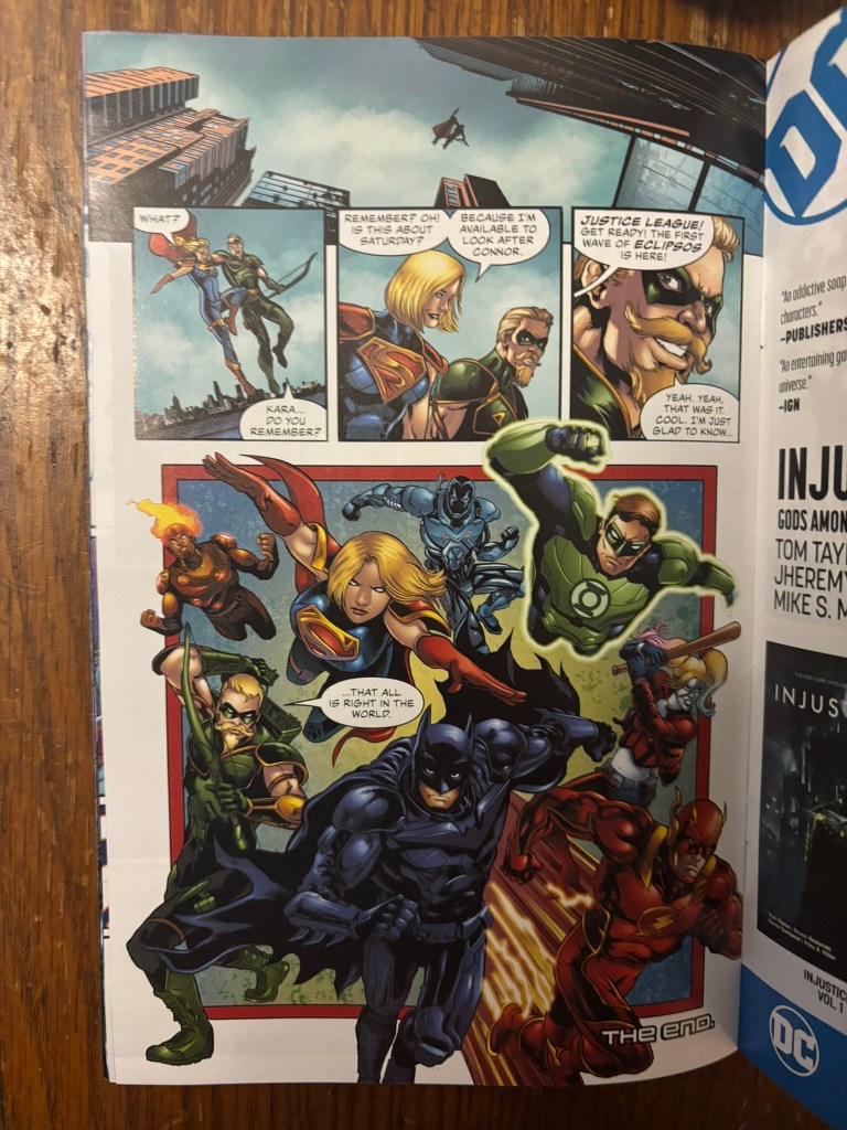 Ollie of course wakes up to his wife uttering another woman’s name before we get a couple pages of the universe being set back to right and we close out on a really nice hero shot of the new Justice League. To close out this book there’s a couple pages of ads, first of the Injustice series of comics, then other collected editions from DC, mostly Justice League and Crisis stories, a Dwayne Johnson Black Adam jump-scare, and finally an advertisement for the DC Universe Infinite app.