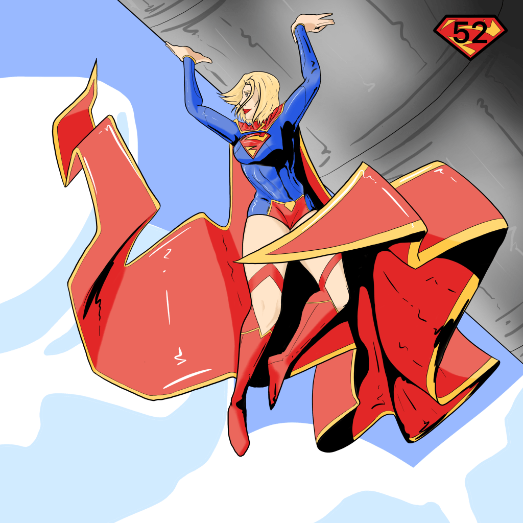 As with all my Supergirl in the Multiverse posts, this is my own artwork. New 52 era Supergirl is floating in the air with a large metal object held aloft in her hands. There are blue skies and clouds all around an her cape is billowing around her. The top right corner has a motif of Supergirl’s S symbol with a 52 on top of it.