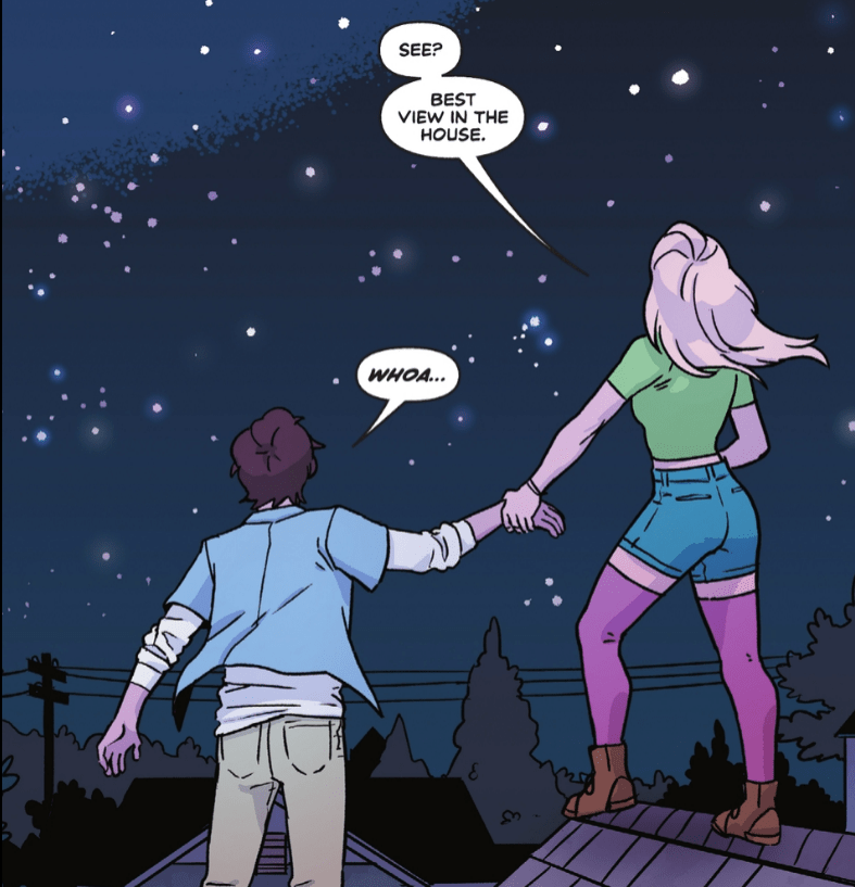At this point we find out Linda has been sneaking up onto Allen’s roof for some time now since it has a better view of the stars. This seems to be a tradition for the pair and we see a few other nights of the pair looking at the stars and chatting late into the night. Linda begins telling Allen of dreams she has of a different night sky and different stars and it’s a memory of Linda’s birth parents and her dad telling her the names of the stars and constellations. Linda tells Allen of some of the constellations like Flamebird and Nightwing before we go into a brief montage of Allen working on a project in his room.
