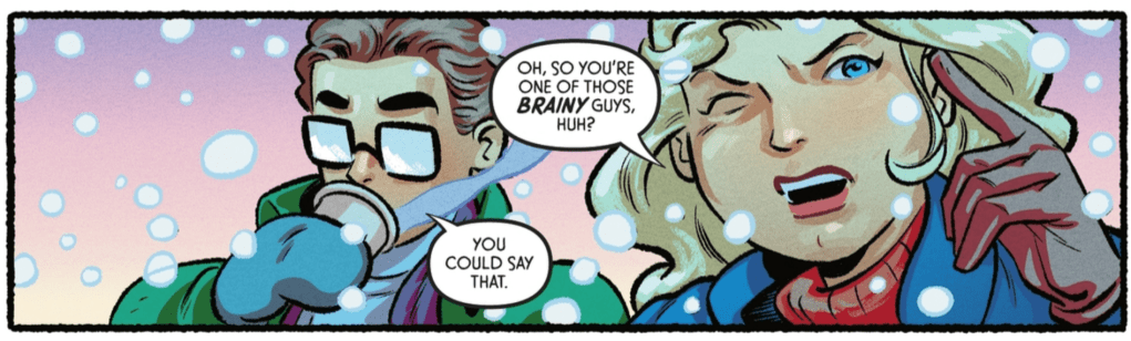 Moving on to I Saw Ma Hunkel Kissing Santa Claus, and the story Holiday Woes. Featured above is the variant cover to the book by Ryan Sook, and the Supergirl story is written by Ash Padilla, pencils by Anthony Marques, inks by J.Bone, Colors by Nick Filardi, and letters by Steve Wands. This story has Kara being invited to the Kent farm in Smallville for Christmas where Clark has set up his cousin on a blind date with Pete Ross’s son. A lot of this 10 page story is Kara worrying about her super-heroic responsibilities in National City, but we’re soon introduced to Kara’s blind date (or are we?)