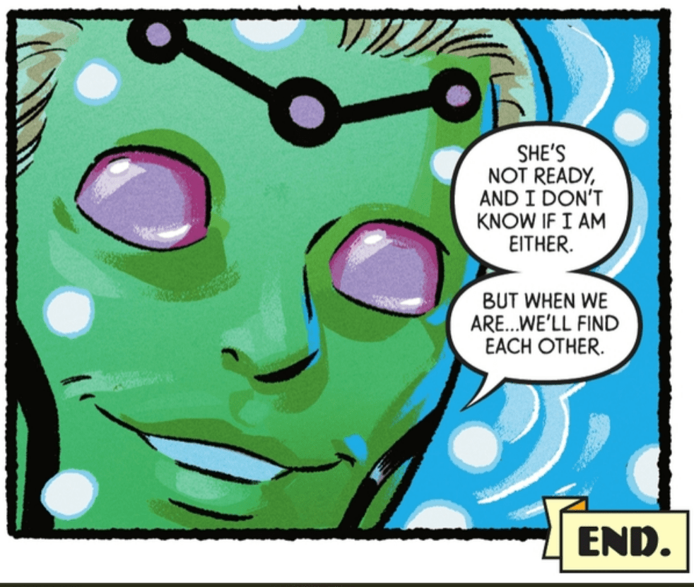 After this her date seems to disappear, and Kara catches back up to Lois and Clark who found Jonathan Ross, her blind date, and Kara realizes the person she had been talking to was not the ambush date at all. Kara tells Jonathan she’s not in the mood for a date and would rather spend time with her family. At this point we find out that the person Kara had been talking to was none other than Brainiac 5 from the Legion of Super-Heroes! This long time love interest of Supergirl is probably my number 1 pick for a boyfriend for Supergirl so I got really excited with this final panel reveal. On a whole, I didn’t really care for this story and this Supergirl didn’t particularly feel in line with the current era of Supergirl so it felt a bit disjointed and the only real enjoyment I got out of it was the inclusion of the future green boy.