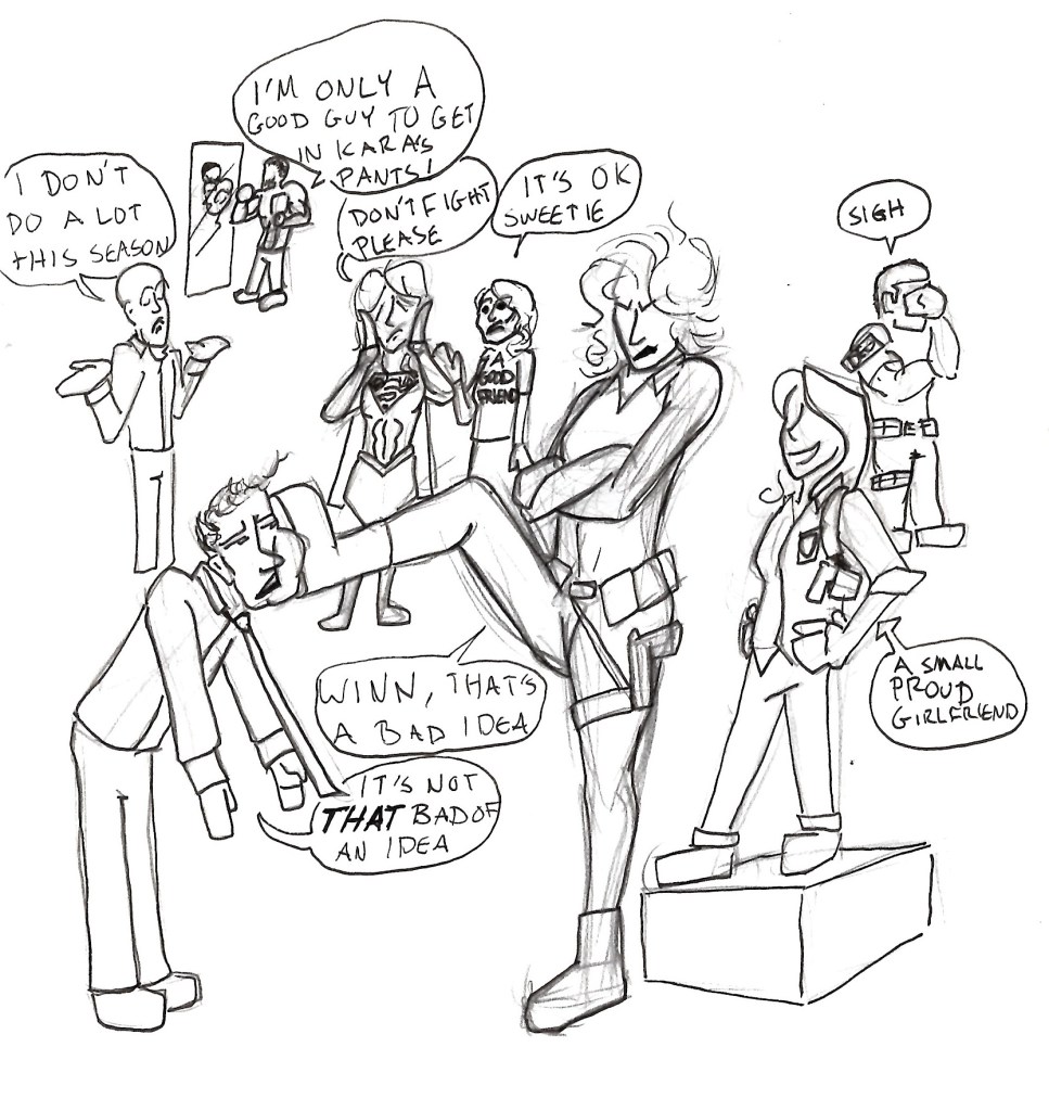 This is the aforementioned Supergirl Season 2 drawing made hastily when I was thoroughly invested in the Supergirl show and probably reading an absurd amount of Supercorp fanfiction as we all were back in 2017. For those of you who can’t immediately tell what’s going on I’ll describe it from left to right and top to bottom. Starting with James saying “I don’t do a lot this season”, then Mon-El flexing in a mirror “I’m only a good guy to get in Kara’s pants”, Supergirl onlooking the scene in front of her says “Don’t fight please”, while her good friend Lena pats her shoulder and says “It’s ok sweetie”. The scene in the front has Alex with her boot on Winn’s face with the pair saying “Winn, that’s a bad idea” “It’s not THAT bad of an idea”. Maggie Sawyer is standing on a box with a bubble saying “A small proud girlfirend” while J’onn is standing in the background sighing.
