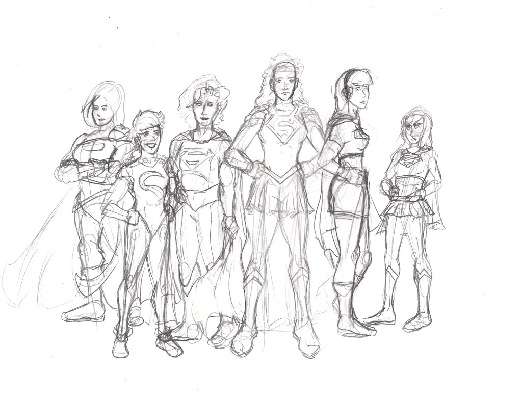 This set of 3 drawings is all part of my attempt at differentiating and defining what I had considered to be the 6 clearly defined versions of Supergirl. In all actuality, after an absurd amount of Supergirl research, I feel like 4 is a better number but it’s also kind of like the 4-6 canon Robins depending on how you count. The 6 Supergirl’s I decided on for this almost-project were Power Girl, Cir-El, Modern Kara Zor-El, Pre-Crisis Kara Zor-El, Linda Danvers/Matrix, and Pre-Flashpoint Kara Zor-El. Like I said, having Kara Zor-El on there 3 times is probably overkill and at most all versions of Kara Zor-El can basically be broken down to be older than Kal or born after Kal on the floating chunk of Argo. Woman of Tomorrow tried to do both and the history doesn’t really make sense with that but that’s another conversation. You can also see here the start of me looking at the S Symbol and how it can have slight variations to define separate Supergirls, which would later become a staple of my Supergirl in the Multiverse series.