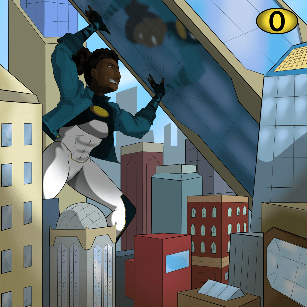 As with all my Supergirl in the Multiverse posts, this is my own artwork. Tanya Spears, Power Girl II, is towering over a city. Surrounded by skyscrapers, Power Girl II stands as a skyscraper herself and she is supporting a toppling skyscraper from falling. A motif in the top right has a gold oval with a 0 on top of it.