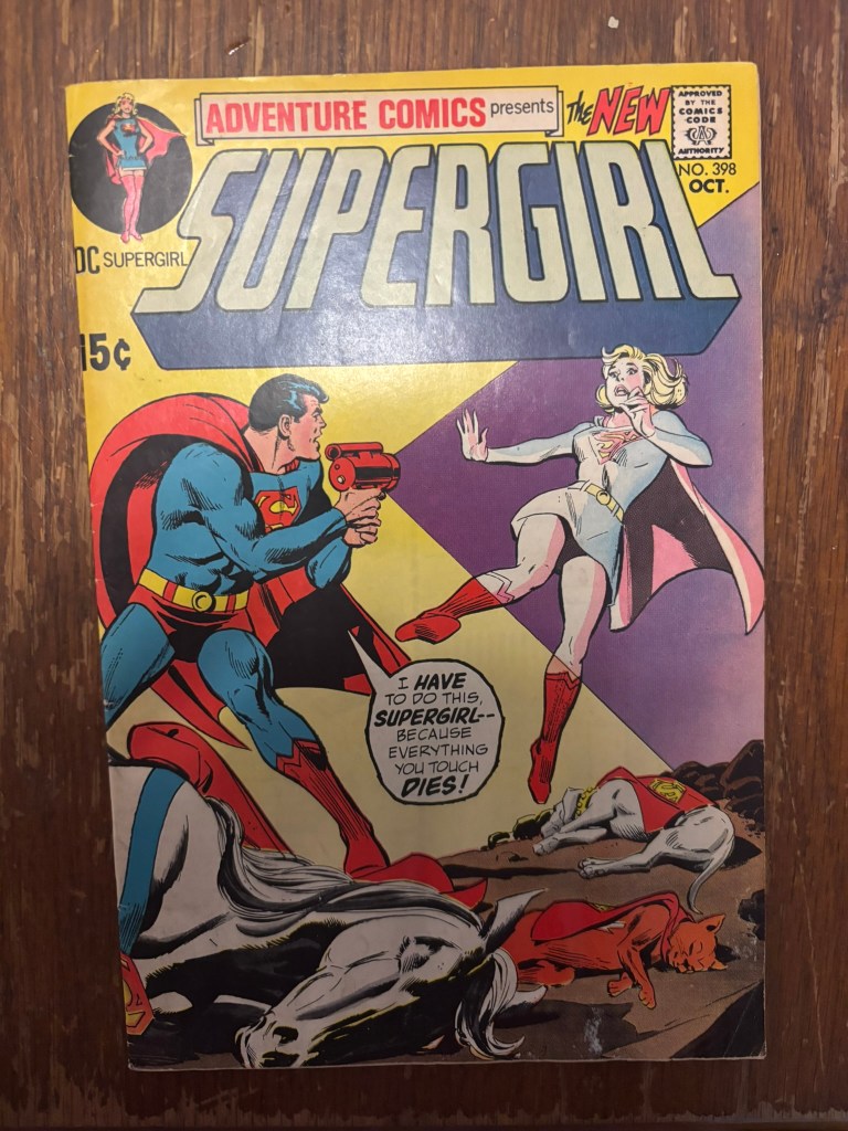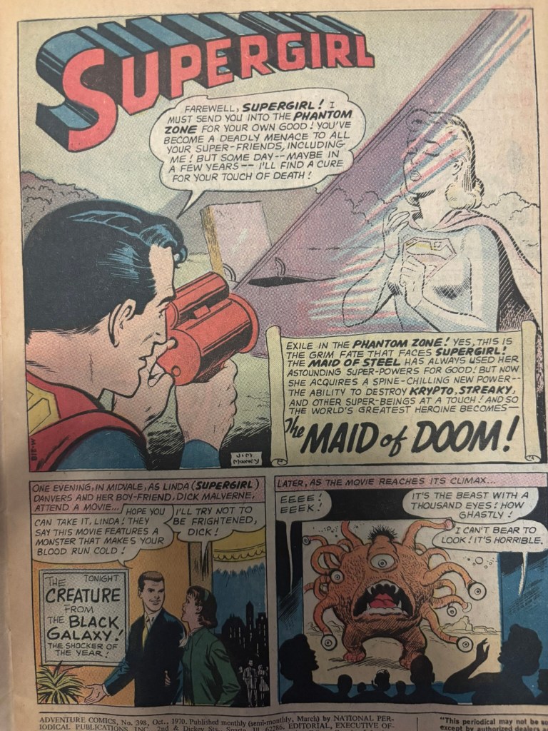 This month’s endeavor into my boxes of comics lead me to an issue in Supergirl’s 40ish issue run in Adventure Comics, specifically issue 398. I can’t remember entirely how long it was, but for a portion of Supergirl’s Adventure run each issue would reprint a previous Supergirl story as well as a brand new story and issue 398 is one of those. The reprint issue for this issue is a 14 page story from Action Comics #306, and the new story is comprised of 6 pages. There is a nice parity between these 2 stories as they both feature an unknow alien antagonist that Supergirl has to overcome, but are otherwise quite unrelated. This issue was released with a cover date of October 1970 and the Action Comic story is from 1963.