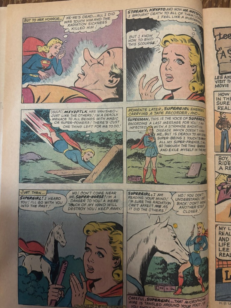 After landing back on earth near her secret entrance to the Danvers’ home, she is met by her trusty Super-Cat Streaky. Unfortunately for Streaky, it seems Supergirl has brought back a deadly virus back to earth which has tragically ended the life of the unsuspecting cat. Krypto, also nearby, comes over to see what’s going on and meets the same fate. Both of the super-pets had a bluish glow about them as they passed leading Supergirl to believe the root of the deadly virus came from the planet Erg. Thankfully the virus only seems to affect super-beings which is revealed when Supergirl tells her adoptive mother, Edna, what happened. This is not the end of tragedy though as Mr. Mxyzptlk and Comet both fall to the Maid of Doom before Superman shows up and tells her the only safe place for her is the Phantom Zone.