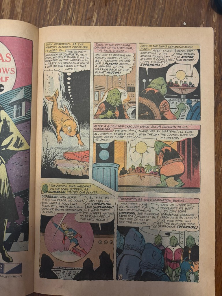 After our hero is subjected to the same fate as Mon-El, we get a surprising image of Superman turning into a fish before diving under a lake. From here we find out that wasn’t Superman at all but one of the Plasmos from the planet Mutor! We find out from Sklor, the Plasmo, that he had just successfully executed a plan to rid Earth of it’s heroes Supergirl and Superman so that the rest of their race can take over the planet. Sklor retells the story from his point of view and we find out that Supergirl is not the deadly menace we were led to believe and all the deceased super-beings were actually Sklor shape changing and acting. He was also able to convince Superman and the Super-Pets to go to the future as to not disturb his plans.