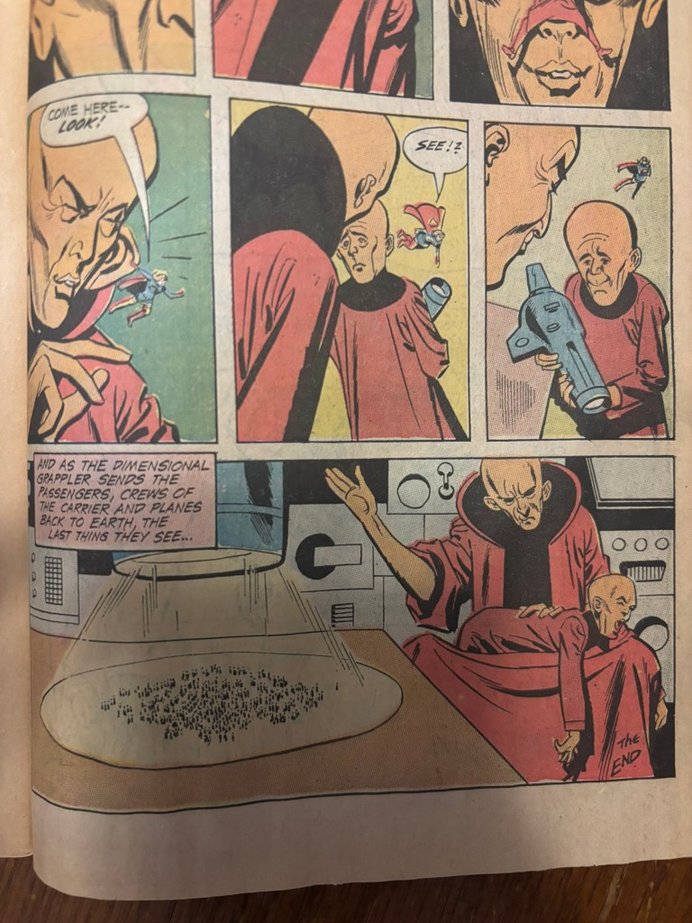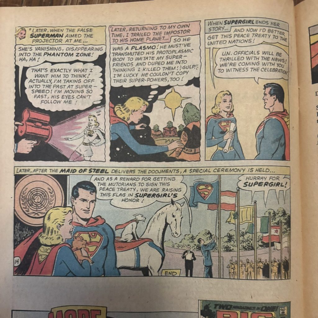 All looks pretty dire for the girl of steel when suddenly she shows up again in the Plasmo’s lair! Supergirl, through some rather convoluted reasoning, was able to thwart Sklor. After realizing the best plan they ever could’ve thought of ended in failure, the planet Mutor decides to sign a treaty with Earth and also to not conquer any other planet. The UN celebrates by raising a Supergirl flag and everyone is happy aside from probably Sklor who probably doesn’t have many friends left on Mutor.