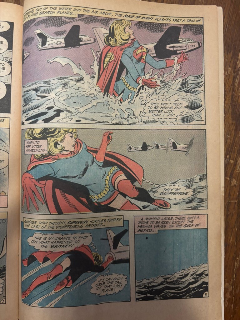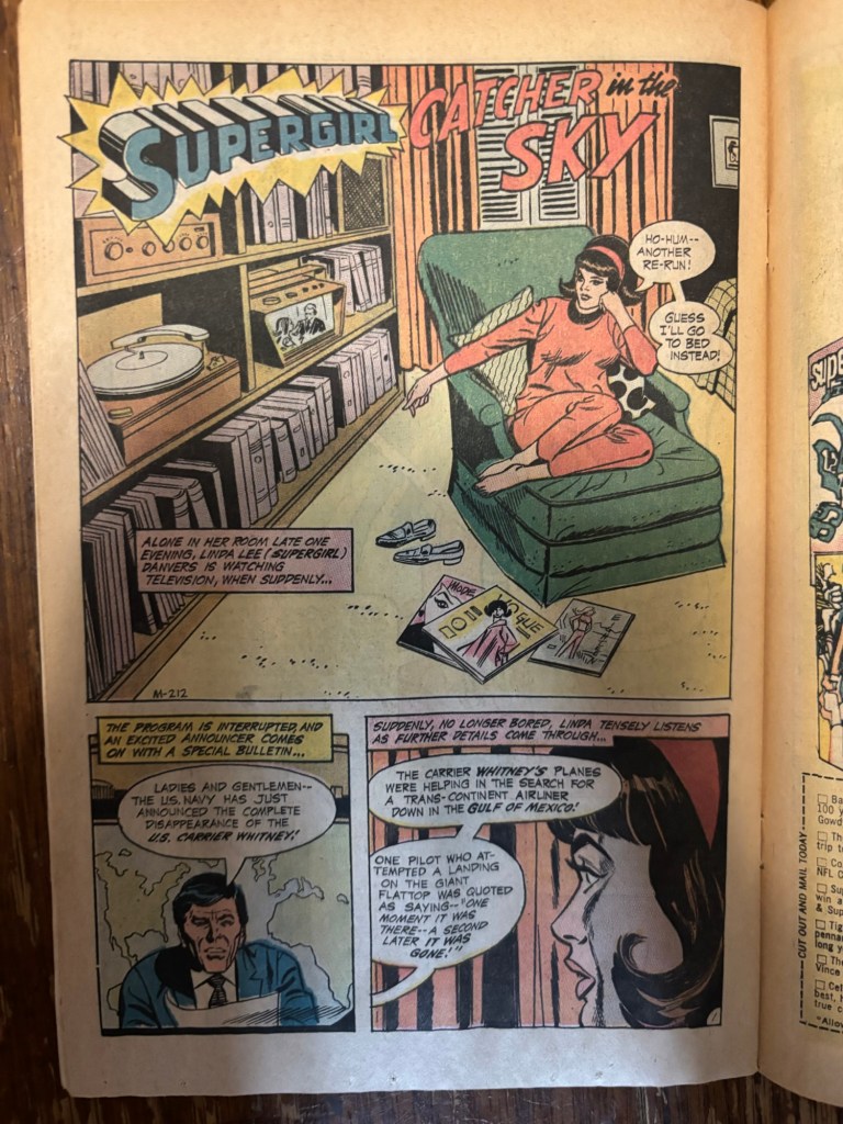 “Catcher in the Sky”, by Mike Sekowsky with inks by Dick Giordano and letters by John Costanza is a brief little 6 page story with some really exceptional imagery of Supergirl. Linda is sat bored at home watching reruns on TV when she hears of a mysterious tragedy as the US Carrier Whitney has vanished into thin air. Supergirl suits up and rushes to the scene.