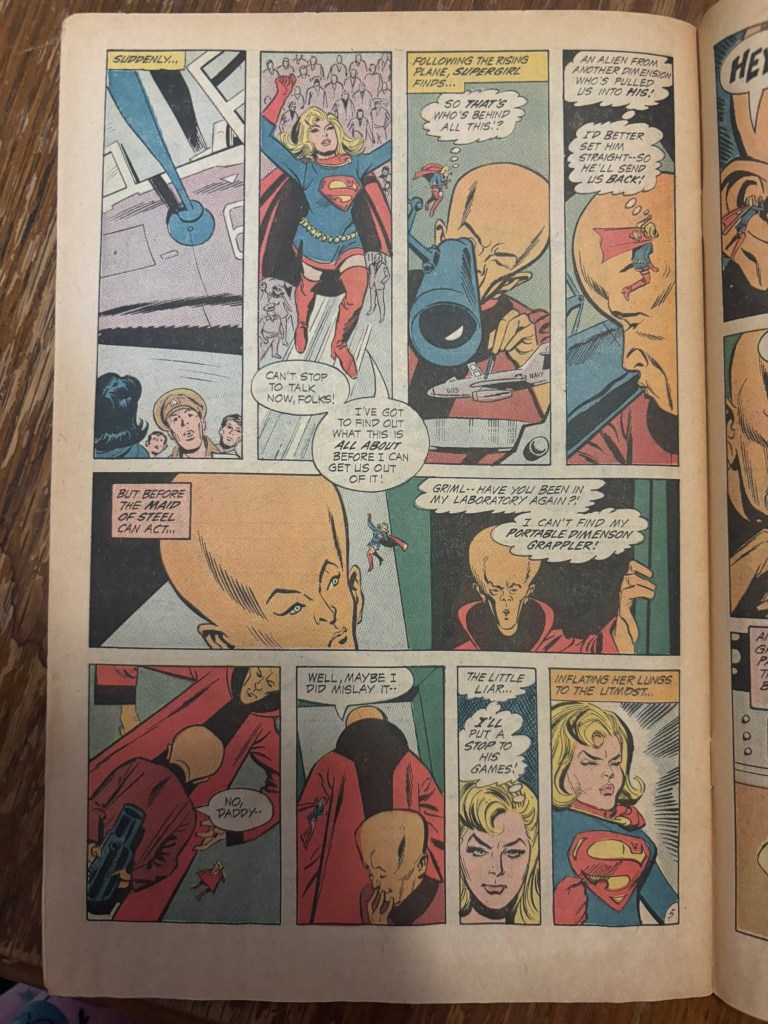 It seems like the son of a scientist from an alien alternate dimension has been messing around with his dad’s equipment and has snatched stuff from our world into his. This alien race is much larger than any earth being so it takes all of Supergirl’s strength to get their attention to get her and the people of earth back home.