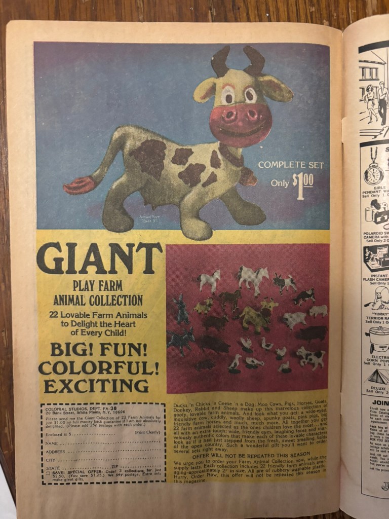 While I didn’t see any letters that really stood out to me, I have to note that “Super Fe-Mail” is a particularly bonkers choice for a letters page. This isn’t the first time I’ve seen this and it definitely won’t be the last but I needed everyone else to know about it. I also found this really cute ad for some animal figures and the cow at the top just looks really goofy. Neither of these stories are astounding by any means, but they’re goofy 60s-ish super hero alien stories and I always have a fun time with those. And between the cover and the interior art it’s a rather stunning issue visually.