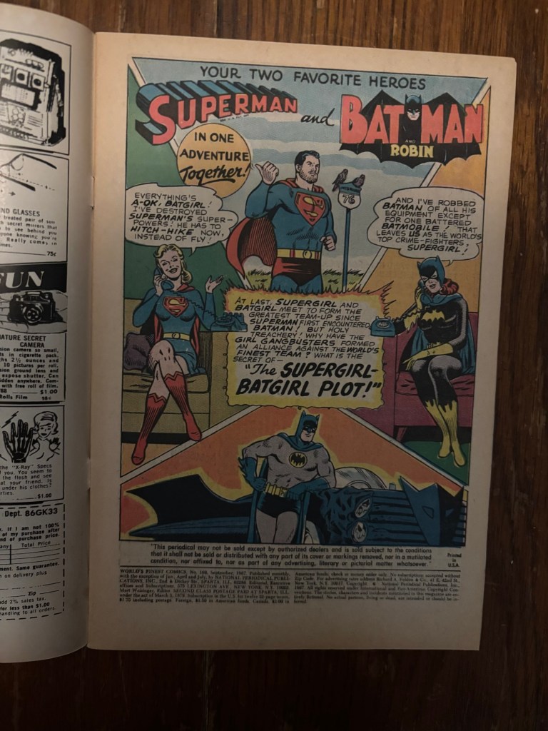 Both of these stories feature some kind of twist at the end and this will be a synopsis of the stories so if you do not want to be spoiled on either of these stories, maybe read the books and come back. Unfortunately these books are not on the DC Universe Infinite app so you’ll have to find some back issues or some of the collected editions that feature these stories. World’s Finest 169 from 1967 was written by Cary Bates, had pencils from Curt Swan, inks by George Klein, and letters from Joe Letterese. The story was titled “The Supergirl-Batgirl Plot” but we’ll come to find out that title may be a bit misleading.
