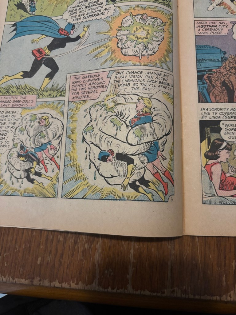 Jumping right in, the splash page shows Superman and Batman pretty down on their luck, while the young female heroes are bragging about it to one another on the phone. The story then begins with Supergirl flying “somewhere between Stanhope College and Gotham City” when she is suddenly attacked by a giant cloud hand! She is unable to break free and Batgirl happens to see this unfortunate attack taking place and tries to lend a hand. While both girls are then captured and the hand is unbeatable by either party, a little bit of teamwork, radiation from Sueprgirl’s x-ray vision, and a bomb from Batgirl’s bag, the pair are able to break free.