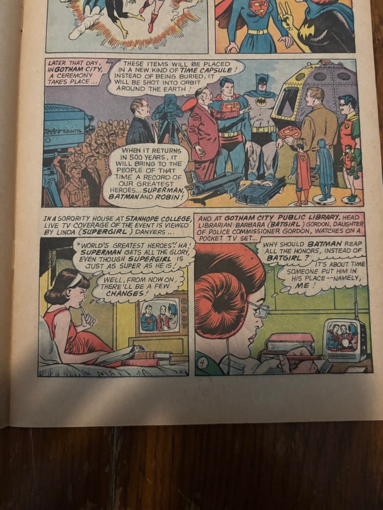 We then see Superman and Batman in Gotham attending a celebration and being recognized by having their costumes and other paraphernalia put into a time capsule to be opened again in 500 years (see you again in 2467). Both Linda (Supergirl) Danvers and Barbara (Batgirl) Gordon see this ordeal on television and make a mental note to themselves that there will be some changes to make the male heroes stop looking so much better that the equally fantastic Supergirl and Batgirl.