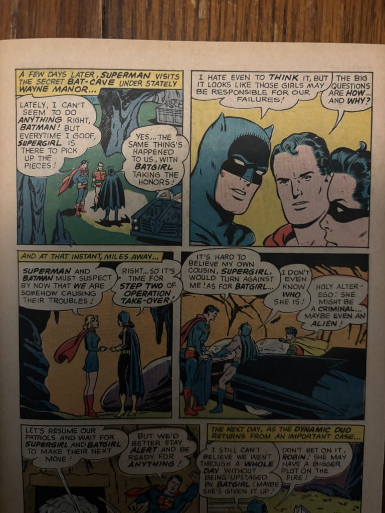 I do much prefer this latter story to the first, but the last page where Superman tells everyone he knew the whole time really undercuts it. It somewhat takes away from Ronald Jason’s story and turns him from a clever and effective actor to someone helpless that Superman is just playing along with. I feel like Jimmy and Robin’s involvement in this story is also unneeded since they really didn’t do much and their removal wouldn’t really change anything. Everything up to and including Jason telling everyone it was all an act was a really engaging story to me and felt like a perfectly reasonable plot line that could get Superman, Batman, Supergirl, and Batgirl to fight each other. I do wish that at least one of these stories had Supergirl and Batgirl actually working together, but there is an issue of Adventure Comics that is a more proper Supergirl/Batgirl team as well as a Superman Family issue so the duo do get their time to shine as a team. Let me know what you think of these stories and if you think I should cover the other Supergirl/Batgirl stories!
