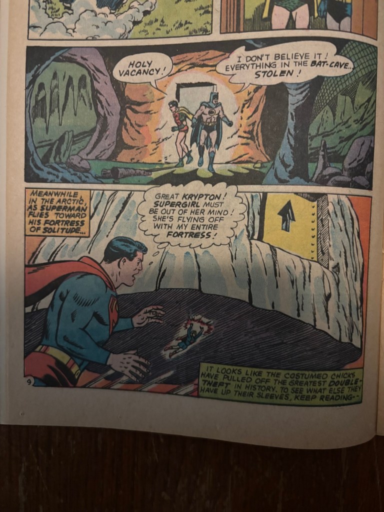 Moving into our second feature, The Superman-Batman Split, from 1968. This story was written once again by Cary Bates, this time with penciling by Neal Adams, inks by Dick Giordano, and letters by Gaspar Saladino. This story thankfully does feature Supergirl and Batgirl, although I wouldn’t necessarily count it as a team up between them, and they are treated more as supporting characters this time as the story features Superman and Batman much more prominently.