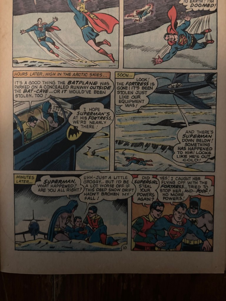 Chapter 2 of the story, Clash of the Super-Teams!, continues right after. Batman and Robin have found the Bat-Plane stashed outside of the Bat-Cave which they fly to the arctic and find Superman stranded. Batman and Robin seem to still be able to continue on in their crime fighting ways, but on a mission Robin seems to disappear with the Bat-Plane leaving just the caped crusader by himself.
