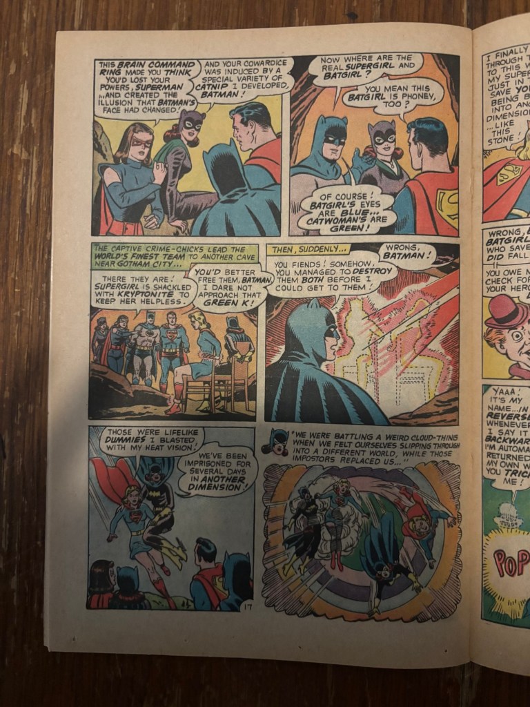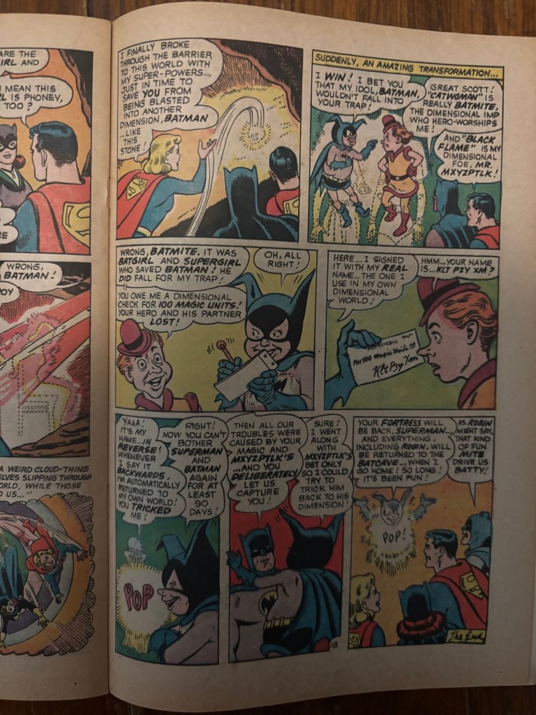 The imposters weren’t actually Black Flame and Catwoman, they were none other than Mxyzptlk and Bat-Mite who are revealed to have been taking bets on which of their hero’s would solve the mystery first. Mxy wins the bet and instead of Bat-Mite actually giving him the earned 100 Magic Units, the fiendish imp instead tricks Mxyzptlk into saying his name backwards thus banishing him to the 5th dimension for 90 days. Bat-Mite reveals he only did all that to get rid of Mxy for a while and everything will be back to normal as if the past 18 pages had never happened.