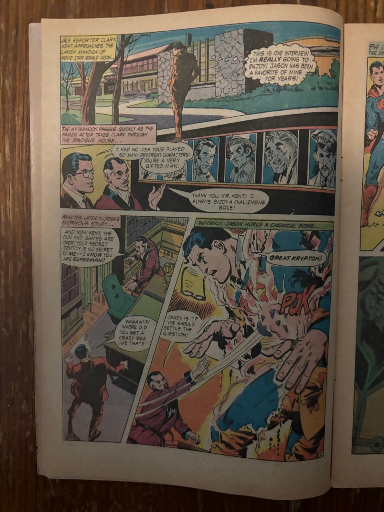 Getting into it, Clark (Superman) Kent is on assignment for the Daily Planet and we seem him starting up an interview with one of his favorite actors Ronald Jason. Terror soon strikes as the actor reveals to the intrepid reporter that he knows Clark Kent is Superman and proves it by launching a chemical bomb at the reporter which leaves him in just his indestructible Superman costume. This isn’t the only reveal however, as the actor too removes his clothing to reveal he is an alien from the Sirius System named Dur and he needs Superman’s help.