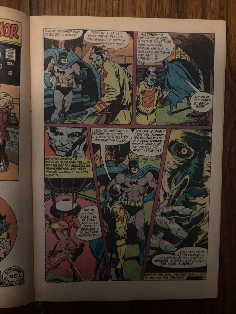 Meanwhile in the Bat-Cave, Batman encounters an uninvited guest in his private quarters named Tiron. Tiron too is an alien from the Sirius System and lets the caped crusader know that Superman has been tricked by Dur and we find out that Dur isn’t an official of the planet but instead a killer and Tiron needs Batman’s help to stop the threat.