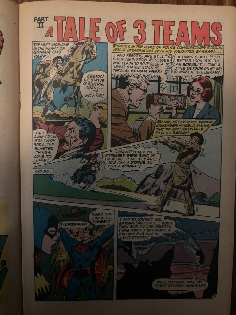 Part 2 of the story, A Tale of 3 Teams, opens with Superman fulfilling his promise and we find out the partner he had in mind was none other than Batgirl. His method of contacting her, dressing up as a statue gone wild, is a bit odd, but I do like this story teaming up Batman and Supergirl and Superman and Batgirl in a subversion of expectations so I’ll let it slide. Batgirl gets filled in on the goings on and we are introduced to the aforementioned 3rd team which is Robin and Jimmy Olsen.