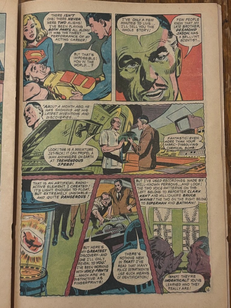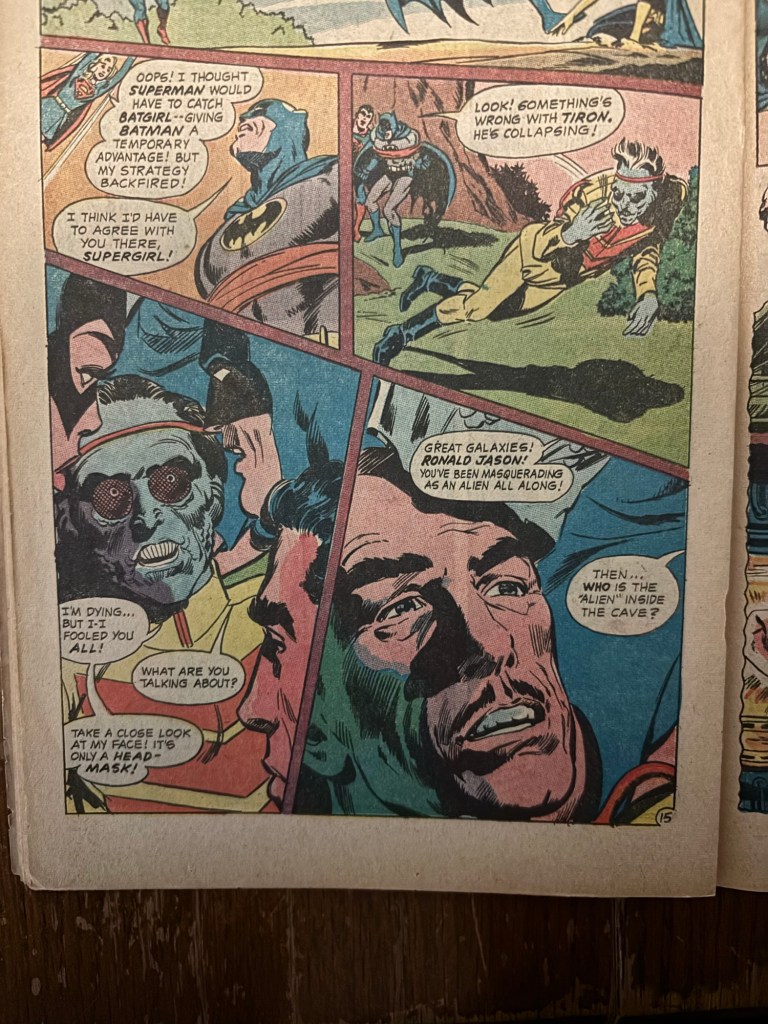After Ronald Jason reveals his story, he then passes away and Robin and Jimmy finally show up on the scene and we find out that this is the secret they discovered earlier before getting hit with sleeping gas. Once again there is a twist as we find out Superman knew all along and simply played along with Jason so he could fulfill his final acting role. Superman used his knowledge of the planet Dur told him about and his x-ray vision revealed that the alien face was just a mask. Superman also filled Batman in on the goings on at some point but the two decided that it would be best if they continued on to let Jason have his final wish. Supergirl and Batgirl however weren’t told of this and they were rightfully pissed since they had been fighting for real.