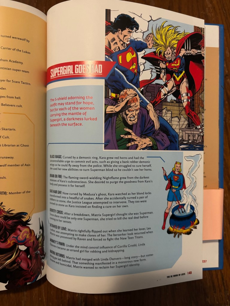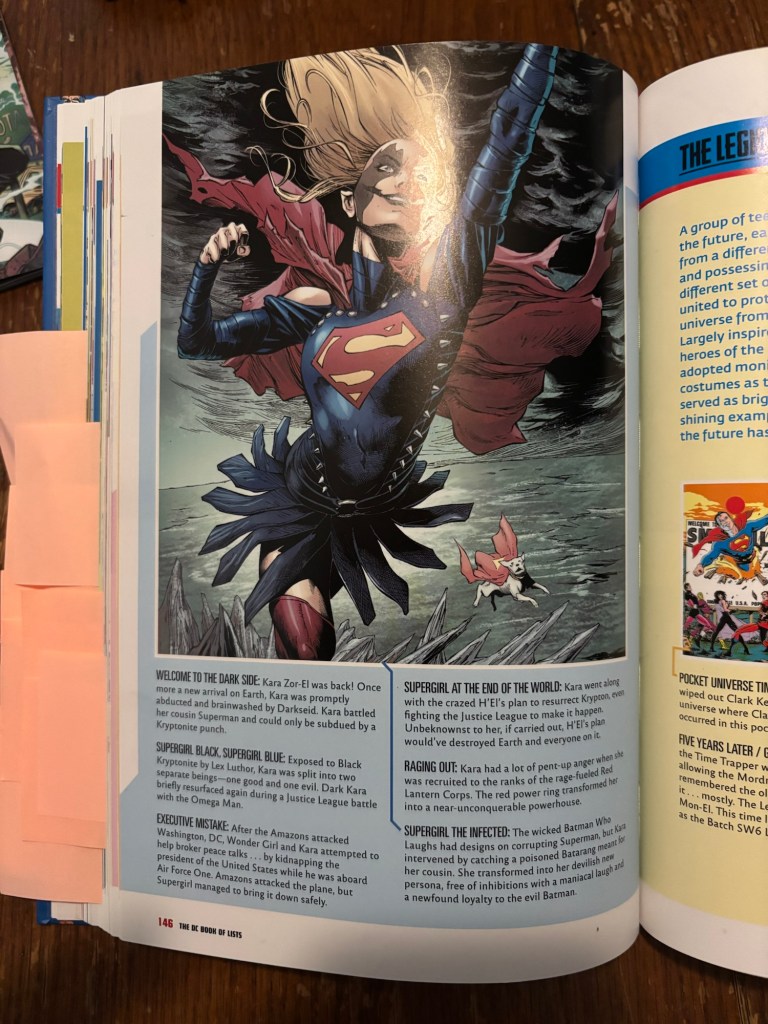 The DC Book of Lists is a book by Randall Lotowycz that takes the 85 years of history (at the time) of DC Comics and reorganizes legacies, histories, and hierarchies – as it mentions on the cover – as well as loads of other information into easy to digest list format. Published by Running Press and released in 2021, this is a fun book that seems to have a lot of research put into it and, by Lotowycz’s own admission, doesn’t care about continuity resets and instead takes the entire history of DC when organizing such topics as Superman and Batman’s first meetings (page 64), all the colors of Kryptonite (page 115), and all the times we’ve seen Darkseid sitting down (page 105). While the book has an absurd amount of references to the girl of steel (as you might be able to tell by the mess of post it notes in my copy shown above) but today I’m going to focus specifically on the 2 pages Lotowycz dedicated specifically to Supergirl, and specifically when she strayed a bit from the heroic ideal.