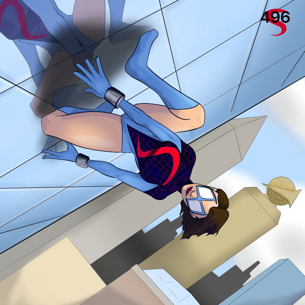 As with all my Supergirl in the Multiverse posts, this is my own artwork. Spidergirl is crouching while sticking to the side of a building. There is a city scape behind her including the Daily Bugle building. The entire scene is skewed making Spidergirl look upside-down. There is a motif of Spidergirl’s S with a 496 in the top right corner.