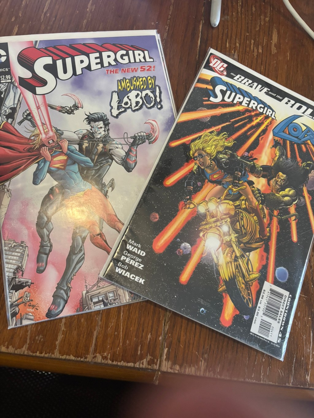 This iteration of The Brave and the Bold tells an overarching narrative throughout the first dozen issues where the heroes of the DC Universe are tracking down the Book of Destiny and I think it sort of resolves itself with the Challengers of the Unknown but it has been a bit since I’ve read the series so I don’t totally remember. Because of this, the story does not immediately open with Supergirl and Lobo and instead has a splash page of Batman merged with Fearsome Five member Tharok and 4 additional pages of Batrok and Blue Beetle (the 3rd one) fighting the Fearsome Five. By no means is this section of the book bad, it’s just not why we’re here. Before we get into the cover feature, the creative team on this book is pretty great on all accounts. Mark Waid and George Perez as storytellers, Bob Wiacek inks, Tom Smith colors, and Rob Leigh lettering.