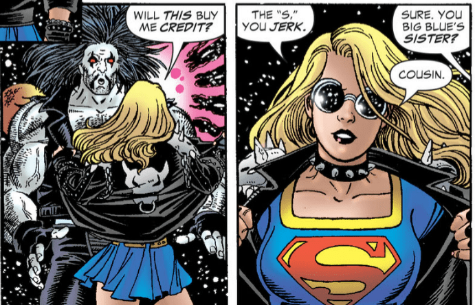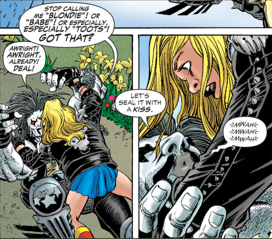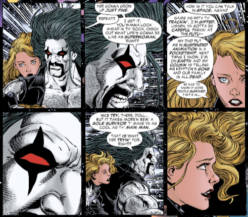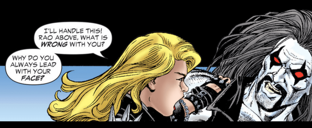We get some absolute banger bits of dialogue throughout this story which I’m going to run down here starting with; “Take y’r x-ray vision off my package f’r one minute and see what you can see.” “That was my microscopic vision.” which points to Supergirl having quick wit as one of her super powers. Supergirl will later ask Lobo “why do you always lead with your face” with the response from the main man of course being “It’s my best feature.” Supergirl absolutely pummels Lobo screaming “Stop calling be “blondie” “babe” or especially “toots” got that?”