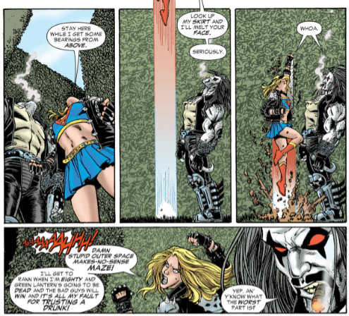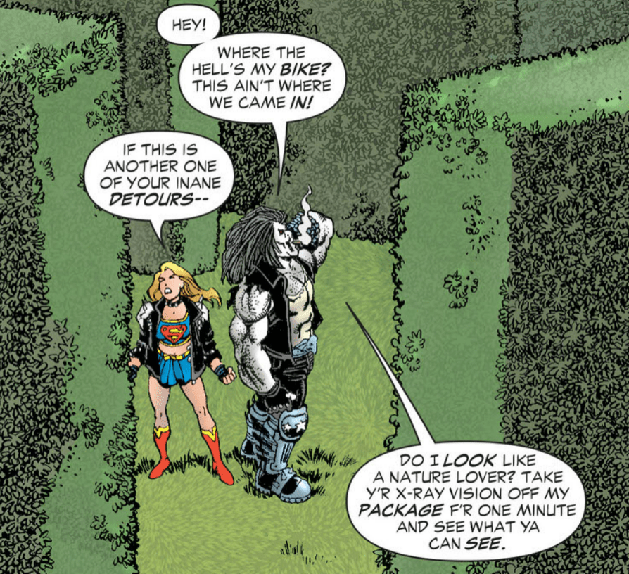 Getting into issue 4 proper now, the Supergirl/Lobo story opens with the pair arm wrestling which Supergirl only agreed to so they would get back on track to getting to Rann and finding Green Lantern. Lobo wins and they continue on their way before soon getting lost in some hedge maze that doesn’t make sense in physical space. Lobo uses his expert tracking super power to find their way out and meet Destiny who gives them some plot which Lobo doesn’t care about so he goes off to find his bike. Supergirl has a bit more knowledge on what’s going on and how to fix whatever overarching plot is happening and the Main Man picks her up and they go back into space, have a little heart to heart, and Lobo drops her on Rann and proceeds to split without getting proper payment since Supergirl assures him the payment was her letting him win the arm wrestle earlier in the story.