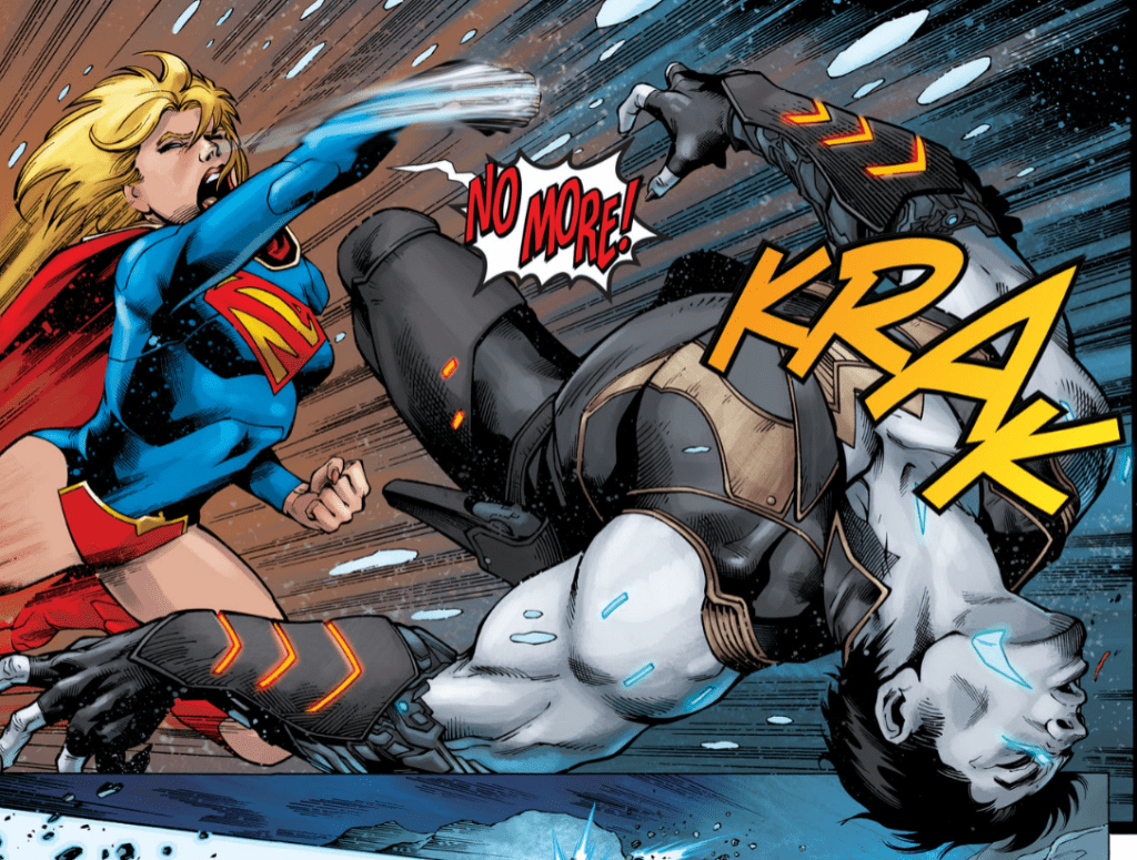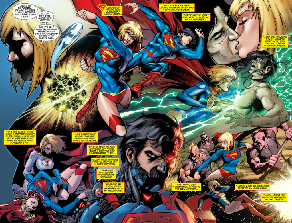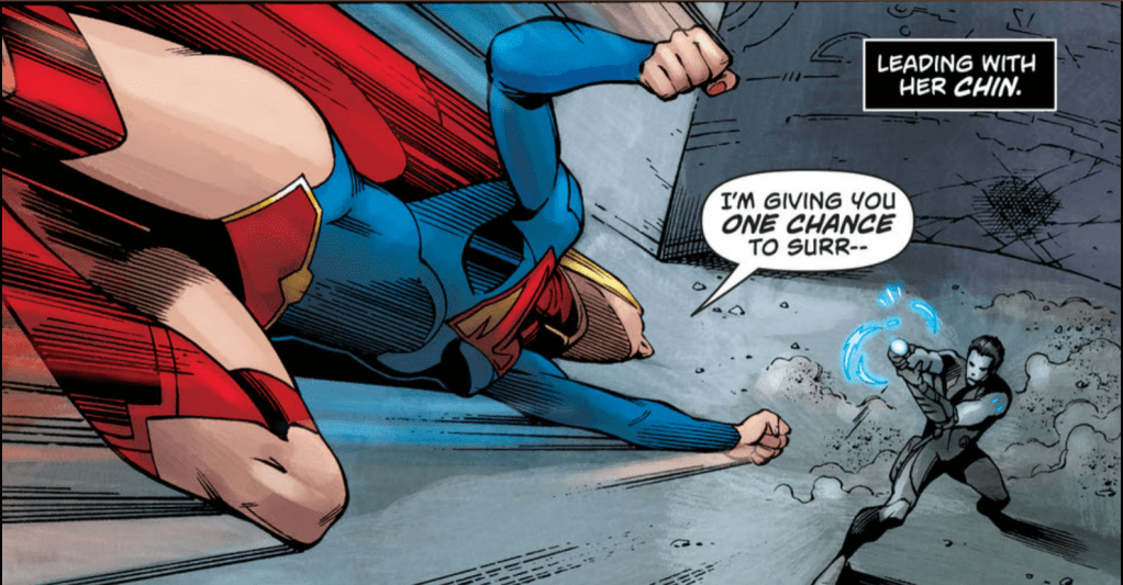 It does seem there is a bit of the writer trying to insert some of that Lobo hitting on Supergirl flair that we got in The Brave and the Bold, but it doesn’t really land for me. We’ve got Lobo referring to Supergirl as “Honey” and calling her cute, but it doesn’t really read as flirtation. We do get Lobo at one point thinking to himself “blondie’s coming. Leading with her chin.” which does have a nice parallel to the other story with Supergirl asking why Lobo always leads with his face. Lobo in Supergirl #26 being driven also has a bit of inverse similarity to Supergirl being so driven while her partner has his own thing going on in Brave and the Bold #4.