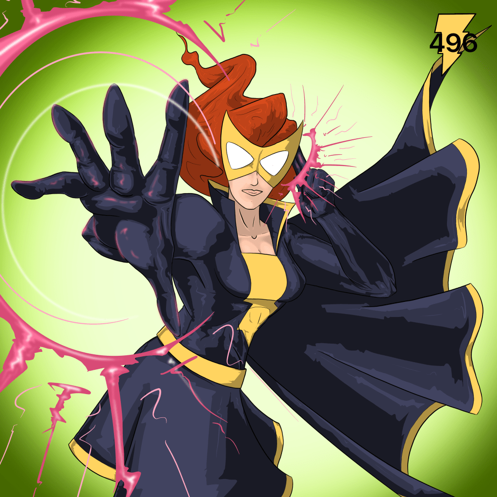 As with all my Supergirl in the Multiverse posts, this is my own artwork. Mary Marvel Girl stands in the center of the panel with her right arm outstretched towards the viewer and her left hand against her head. There are traces of pink energy exploding out from either hand. The background is an ambiguous green space and the top right corner has a motif of Mary Marvel Girl’s symbol with a 496 on top of it.