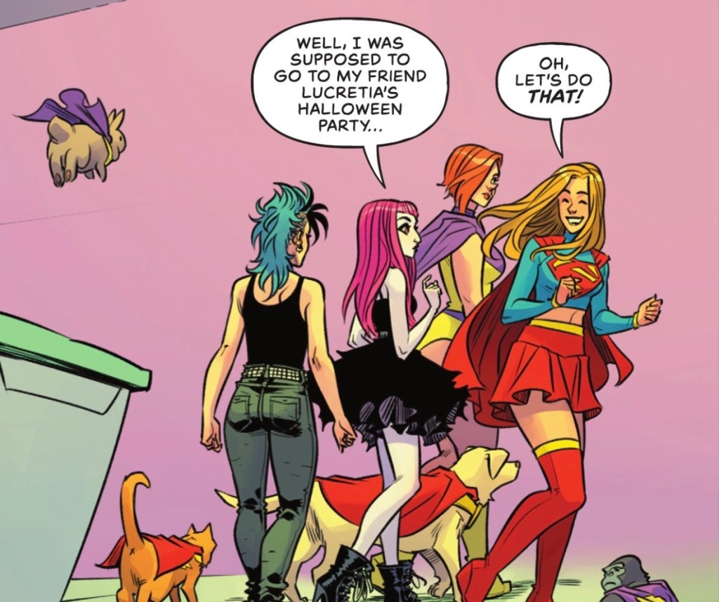 Lesla does begin her superheroic journey as the hero Luminary in part 4 of Misadventures in Midvale and of course a crises happens but Supergirl and friends are able to take care of it. Issue 5 lets Supergirl take a back seat in the story and instead focuses on the 4 super-pets that are common characters in the series; Krypto, Streaky, Kandy, and Tinytano. This is a relatively isolated story but it does mention the fallout of issue 4 and leaves you with a cliffhanger for issue 6. Issue 6 too is relatively isolated and tells a story of Supergirl encountering Nightflame of the Innerverse. This theme of single issue stories building on a larger narrative is true of all the stories in this collection. Even the 4 issues making up the Misadventures in Midvale story each tell their own story with their own plot and antagonist. You get the Titano issue, the Satan Girl issue, and the issue where Supergirl and the L.L. girls go to a goth bar.