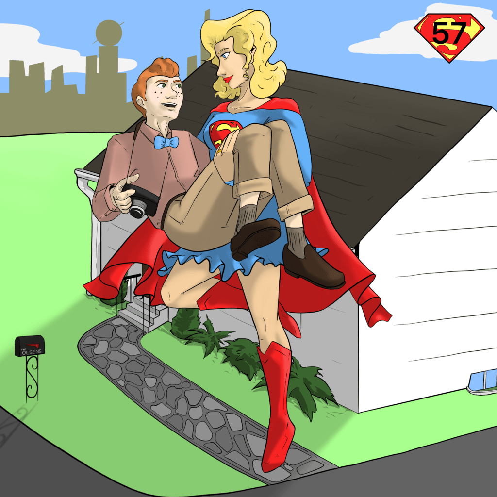 As with all my Supergirl in the Multiverse posts, this is my own artwork. Supergirl is shown bridal carrying Jimmy Olsen with a wedding finger on her hand. Jimmy is holding a camera and the pair are floating in the air. The background shows a skyline including the Daily Planet and the midground has a suburban home with a mailbox that reads “THE OLSENS”. The top right corner has a motif of Supergirl’s symbol with a 57 on top of it.