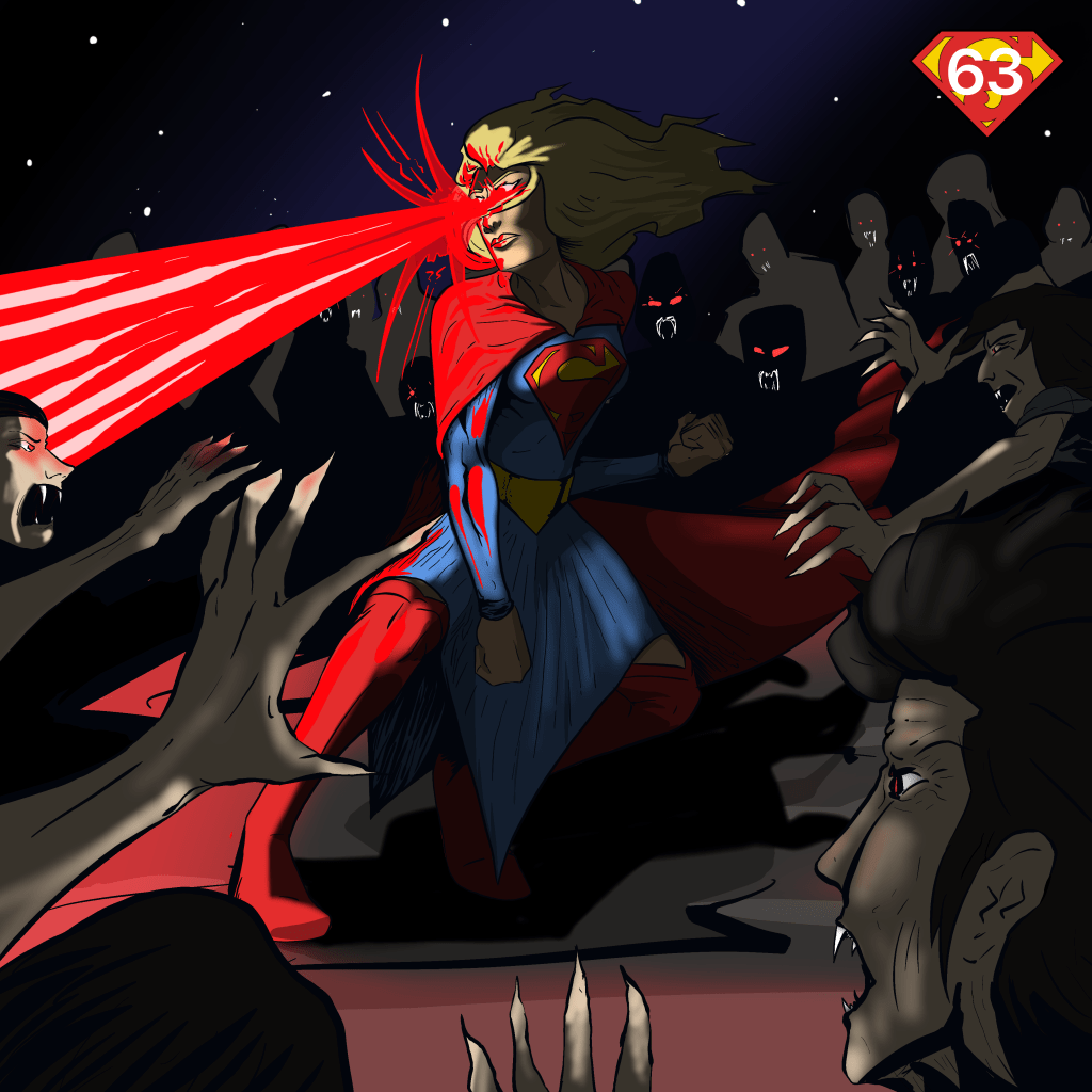 As with all my Supergirl in the Multiverse posts, this is my own artwork. Supergirl is stood in the center of the artwork with a growing horde of vampires surrounding her. Supergirl is blasting a large heat vision burst off the lefthand side of the page. The top right has a motif of Supergirl’s S symbol with a 63 on top of it.
