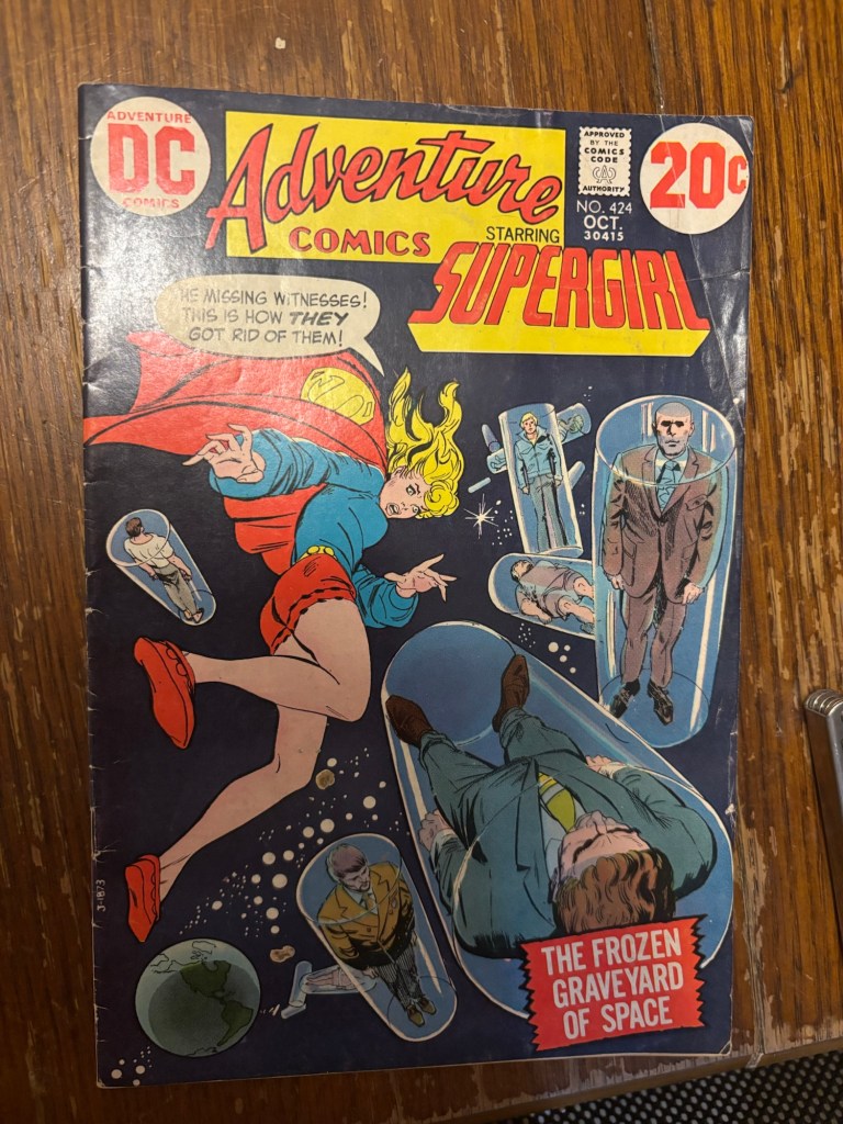 Adventure Comics #424 was released in 1972 and was the last issue of Adventure Comics where the maid of might was the star of the comic. This story, titled “Crypt of the Frozen Graves” follows Linda much more than Supergirl as she is working at the KSF-TV station. Linda has been in contact with a Bruce Ryan who has been leaking information about his connection to the Frisco Syndicate to Supergirl (Linda’s heroic secret identity).