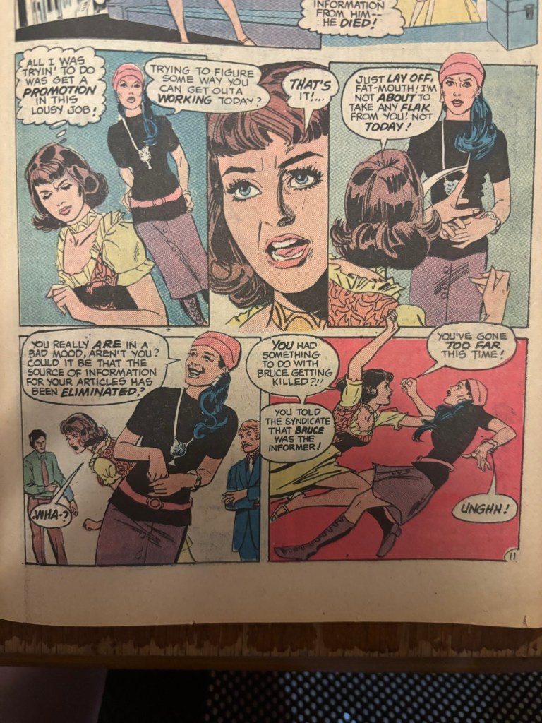 Unfortunately Nasty doesn’t get a whole lot to do here as she does in previous apperances. She is however still antagonistic to her co-worker Linda Danvers as they are both shooting for the same promotion at KSF-TV. It is also stated by Linda that she thinks Nasty let slip to the Frisco Syndicate about Bruce Ryan being a rat and therefore causing the death of Bruce. It’s hard to say if Nasty actually did such a thing or if Linda just lashed out at her in anger. I wouldn’t put it past Nasty to pull a stunt like this just to beat out Linda, but there isn’t much in the story itself to support it. This is also tragically the final issue where Nasty shows up and she doesn’t even get a proper send off in my opinion.