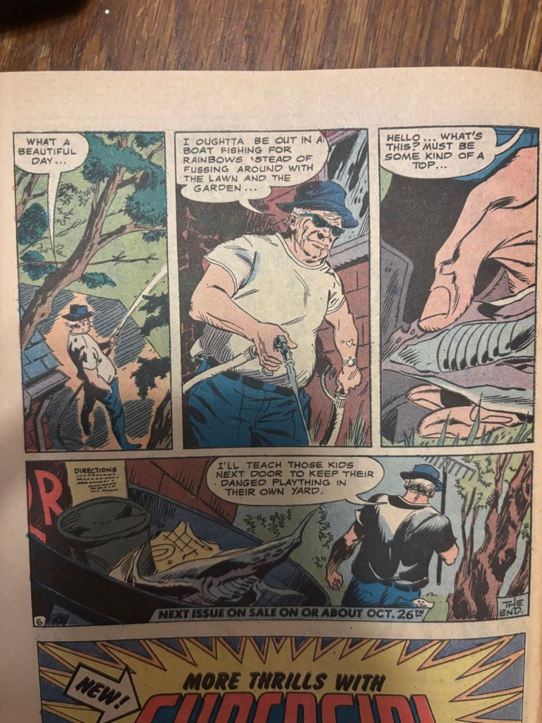 While none of the letters or the ads in this issue really caught my attention, there was a backup story here titled “The Invasion”. This is a brief 6-page sci-fi story following an undefeated crew of alien invaders on another mission to invade and conquer a planet called “Earth”. While the first 5 pages are all building up this crew as a major threat to our planet, there is a very well executed twist at the end where we find out that the invaders are actually quite small and are taken out by an average Joe watering his lawn. He then spots the invader’s spaceship, but due to its small size he guesses it’s a toy and discards it which of course eliminates this terrible threat before it can even be known.